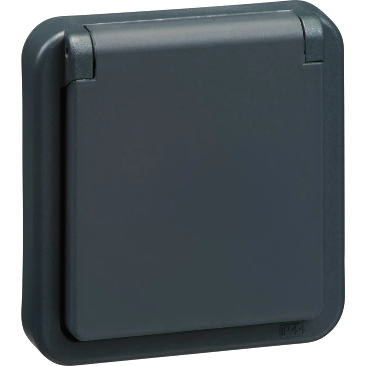 OPUS 74 stikkontakt med dæksel og tangent/låg er designet til både vådrum og udendørs installationer i boliger.